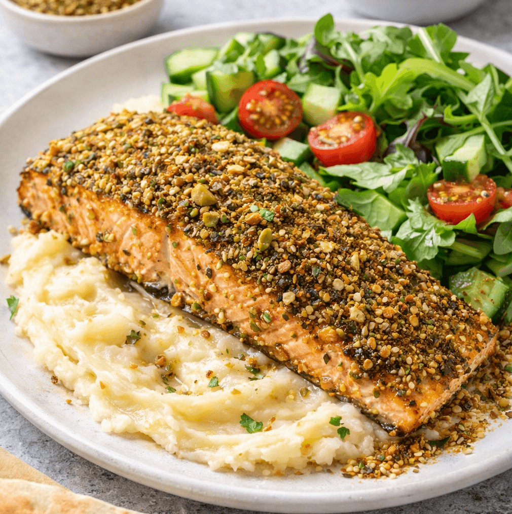 Dans cette recette, le dukkah devient une croûte parfumée qui sublime le saumon : les noix grillées apportent le croquant, les graines torréfiées révèlent leurs arômes profonds et les épices enveloppent le poisson d’une chaleur subtile. Le résultat est un plat à la fois simple, raffiné et dépaysant, qui rend hommage aux saveurs du Moyen-Orient et de l’Afrique du Nord tout en s’intégrant parfaitement à une cuisine moderne.